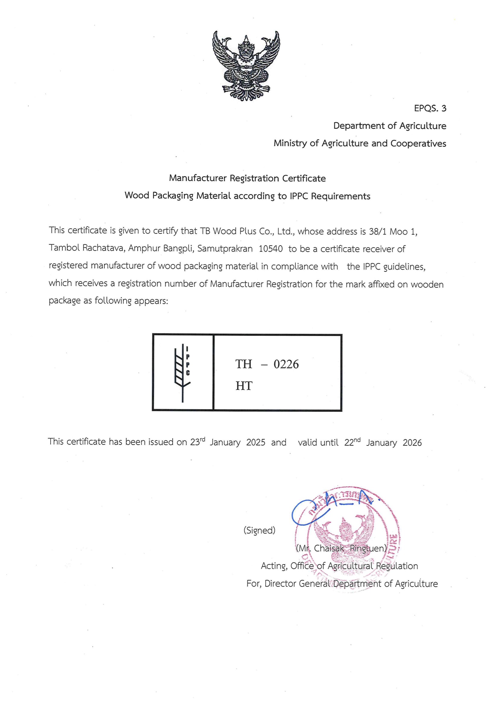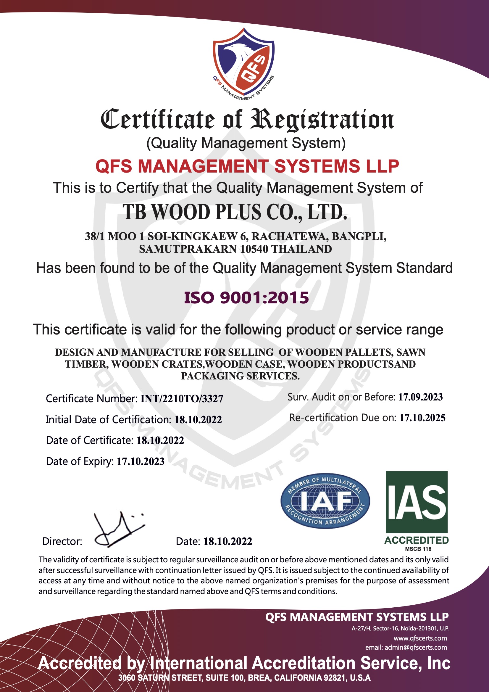 เราได้รับการรับรองมาตรฐาน ISO และ IPPC (ISPM 15) เพื่อรองรับทุกความต้องการในการขนส่งและส่งออกสินค้าอย่างปลอดภัยและถูกต้องตามข้อกำหนดระหว่างประเทศ
